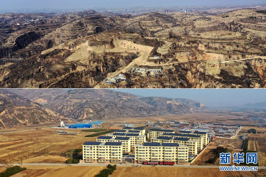 拼版照片:上图为方山县峪口镇石家峁村;下图为峪口镇易地扶贫搬迁安置小区(3月9日摄,无人机照片)。新华社记者 詹彦 摄