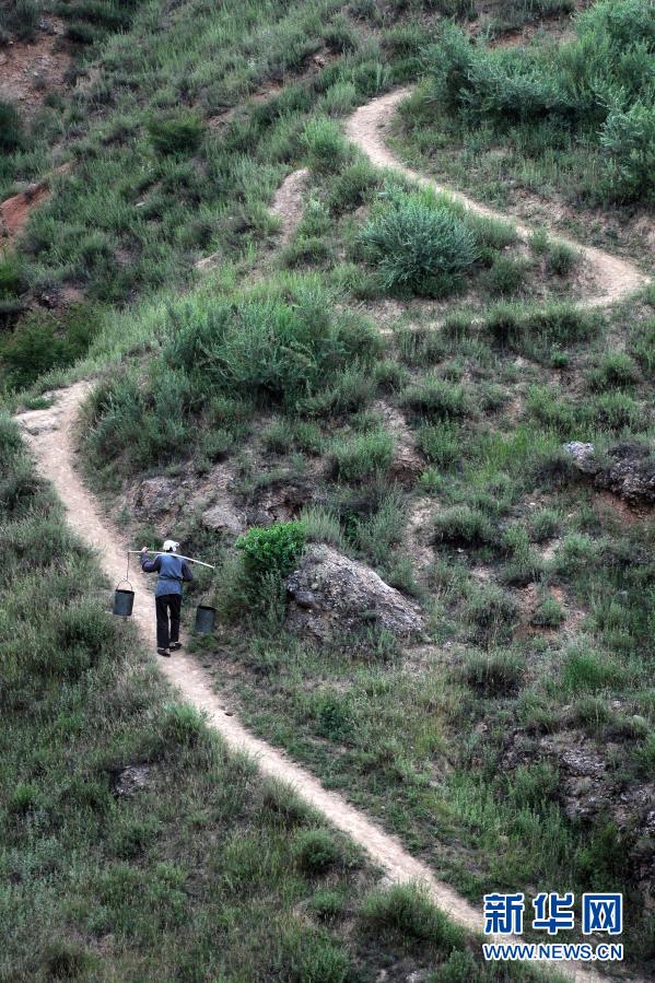 在方山县峪口镇石家峁村,刘庆吉挑着水桶去几公里外的山沟里挑水(2010年6月28日摄)。新华社发(刘亮亮 摄)