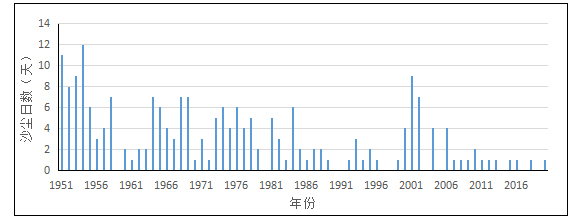 1951-2020年3月份北京观象台沙尘日数(单位:天)