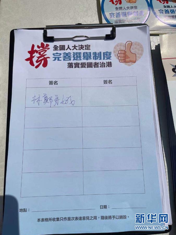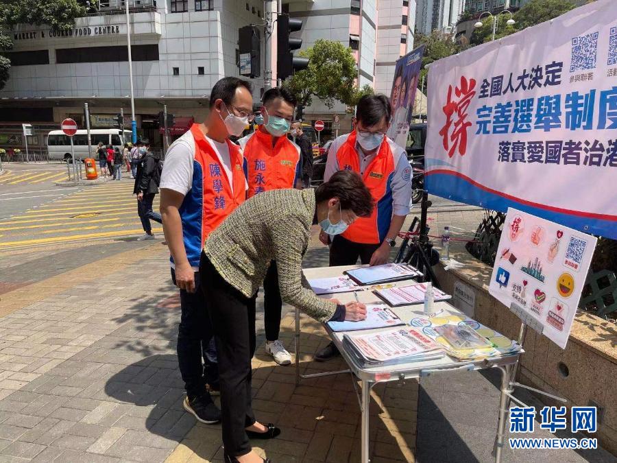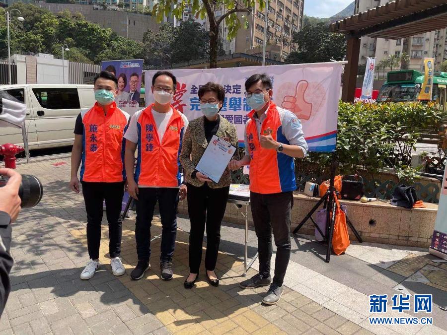 新华社香港3月15日电(记者刘明洋)连日来,“香港各界撑全国人大决定完善选举制度连线”在全港各区摆设街站,收集市民支持全国人大决定的签名。香港特区行政长官林郑月娥15日前往位于港铁坚尼地城站的街站签名,支持落实“爱国者治港”原则,并为街站工作人员打气加油。