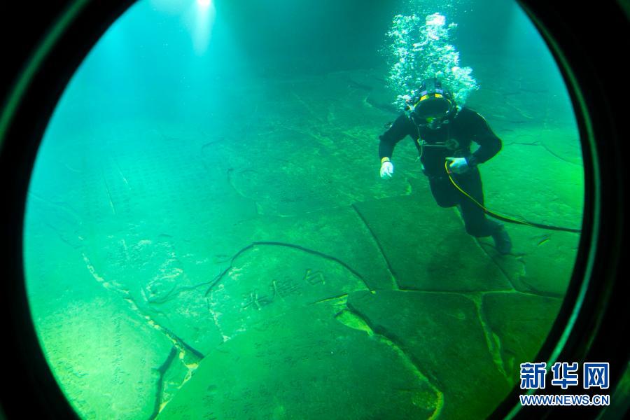 3月15日,在长江水下40多米的白鹤梁题刻无压容器罩内,潜水员在进行清理作业。