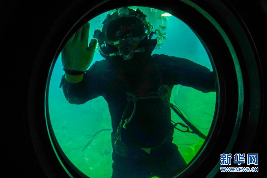 3月15日,在长江水下40多米的白鹤梁题刻无压容器罩内,潜水员在对参观廊道的观察窗玻璃进行清理。新华社记者 刘潺 摄