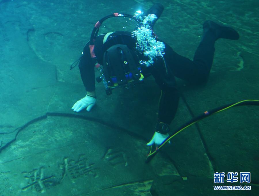3月15日,在长江水下40多米的白鹤梁题刻无压容器罩内,潜水员在对题刻上的泥沙进行清理。新华社记者 王全超 摄