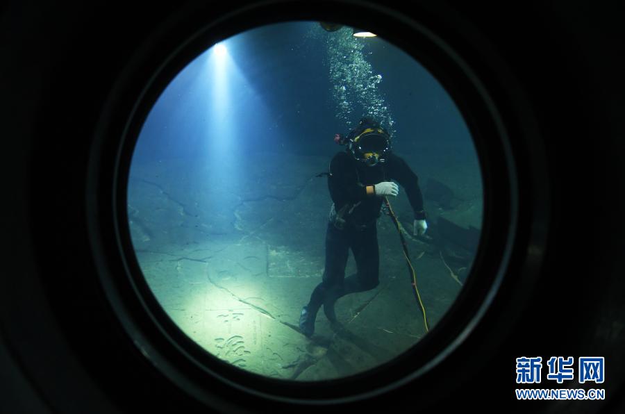 3月15日,在长江水下40多米的白鹤梁题刻无压容器罩内,潜水员在进行清理作业。新华社记者 王全超 摄