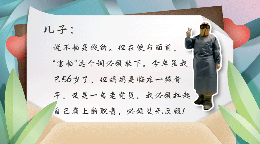 儿子,说不怕是假的。但在使命面前,“害怕”这个词必须放下。今年虽我已56岁了,但妈妈是临床一线骨干,又是一名老党员,我必须扛起自己肩上的职责,必须义无反顾!