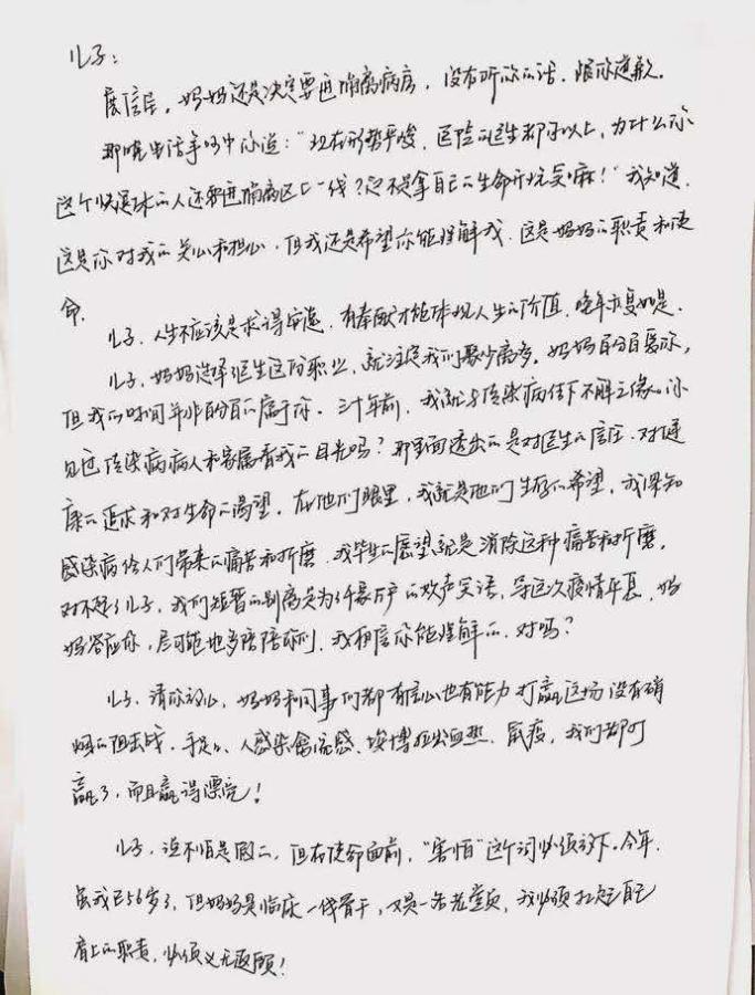 儿子,妈妈选择了医生这份职业,就注定我们聚少离多。妈妈百分百爱你,但我的时间并非百分百属于你。三十年前,我就与传染病结下不解之缘。你见过传染病病人和家属看我的目光吗?那里面透出的是对医生的信任,对健康的追求和对生命的渴望。在他们眼里,我就是他们生存的希望。我深知感染病给人们带来的痛苦和折磨,我毕生的愿望就是消除这种痛苦和折磨。对不起儿子,我们短暂的别离是为了千家万户的欢声笑语。等这次疫情平息,妈妈答应你,尽可能地多陪陪你们。我相信你能理解的,对吗?