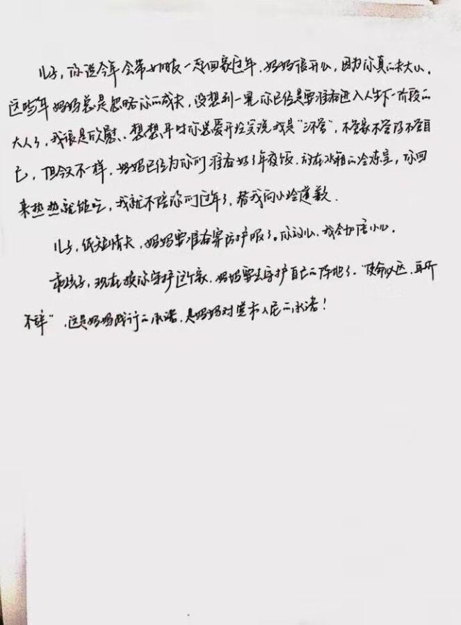 儿子,你说今年会带女朋友一起回家过年。妈妈很开心,因为你真的长大了。这些年妈妈总是忽略你的成长,没想到一晃你已经是要准备进入人生下一阶段的大人了。我很是欣慰。想想平时你总爱开玩笑说我是“三不管”,不管家不管你不管自己。但今天不一样,妈妈已经为你们准备好了年夜饭,放在冰箱的冷冻室,你回来热热就能吃。我就不陪你们过年了,替我向小玲道歉。