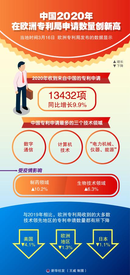 新华社柏林3月16日电(记者任珂 张远)欧洲专利局16日发布的数据显示,2020年收到来自中国的13432项专利申请,同比增长9.9%,中国在欧洲专利局的专利申请数量创历史新高。