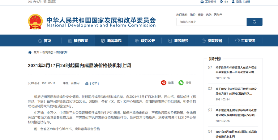 原标题:2021年3月17日24时起国内成品油价格按机制上调