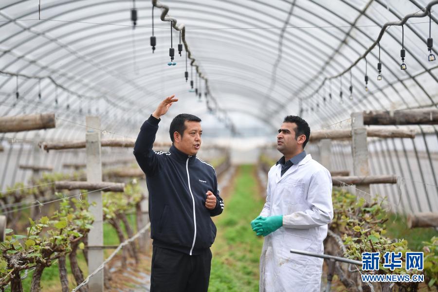 3月17日,陕西杨凌锦田农业专业合作社,农民李海平向金乐天(右)讲解水肥一体化灌溉设备。