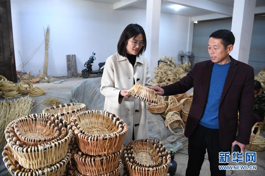 刘晓妮(左)在阜南县郜台乡的柳编加工企业内调研(3月12日摄)。新华社记者 刘军喜 摄