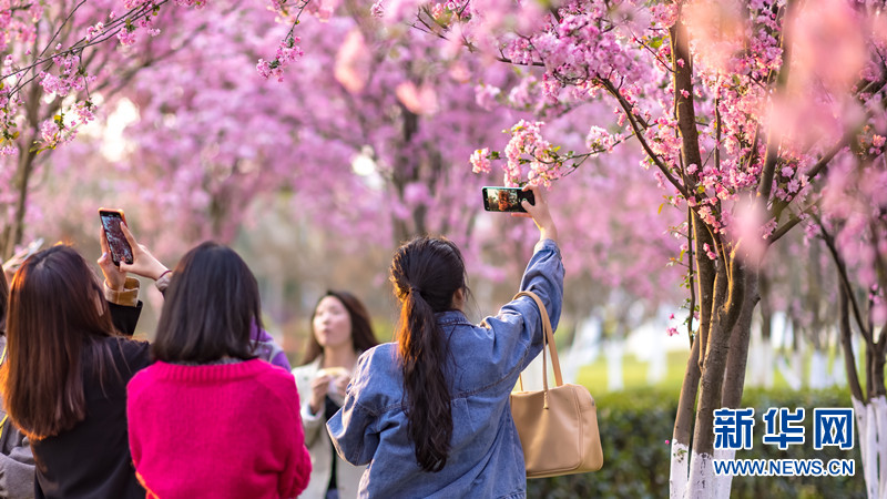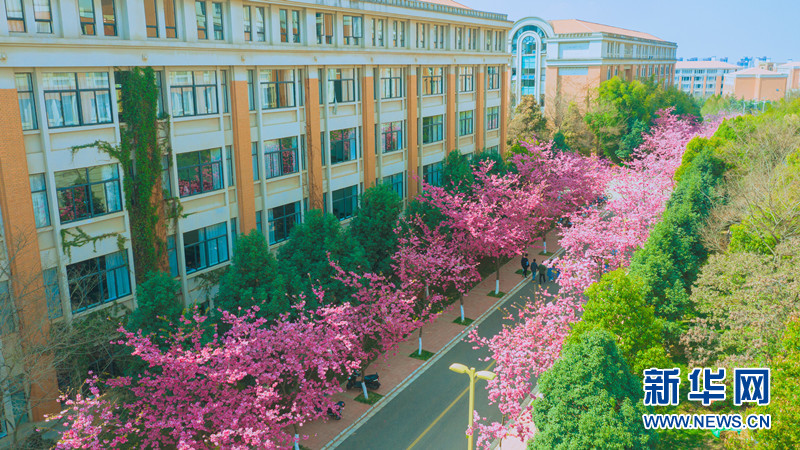 云南大学呈贡校区道路两旁开满樱花。新华网发(李哲 王崴 摄)