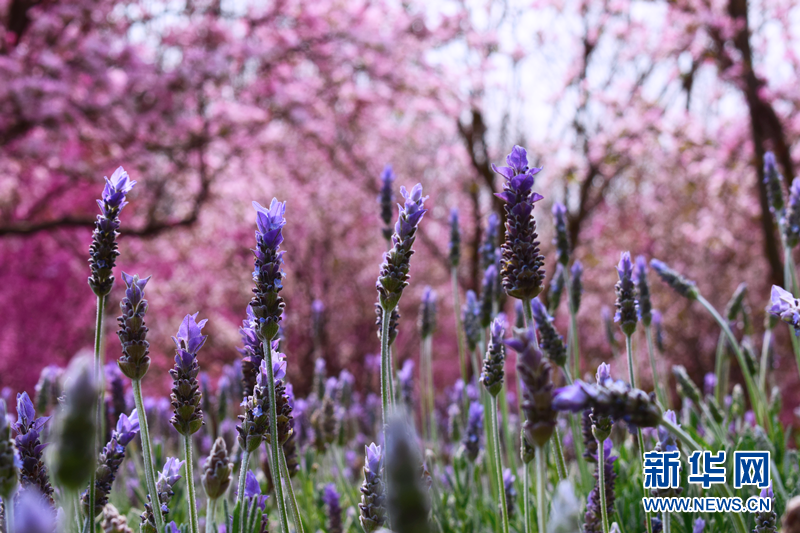 云南师范大学呈贡校区内,薰衣草与樱花相互映衬。新华网发(井润敏 摄)