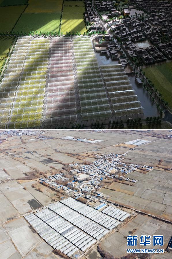 拼版照片的上图是西藏山南市乃东区克松社区农业产业生产基地规划沙盘(2月9日摄);下图是克松社区农业产业生产基地(2月9日摄,无人机照片)。新华社记者 普布扎西 摄