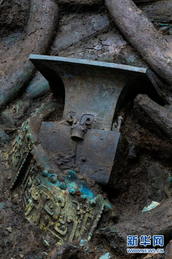 这是在三星堆遗址考古发掘现场3号“祭祀坑”内拍摄的青铜器(3月19日摄)。新华社记者 李贺 摄
