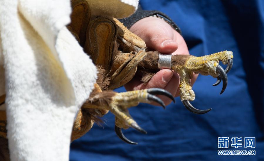 这是3月20日拍摄的佩戴在一只大鵟脚上的环志。新华社记者 陈钟昊 摄