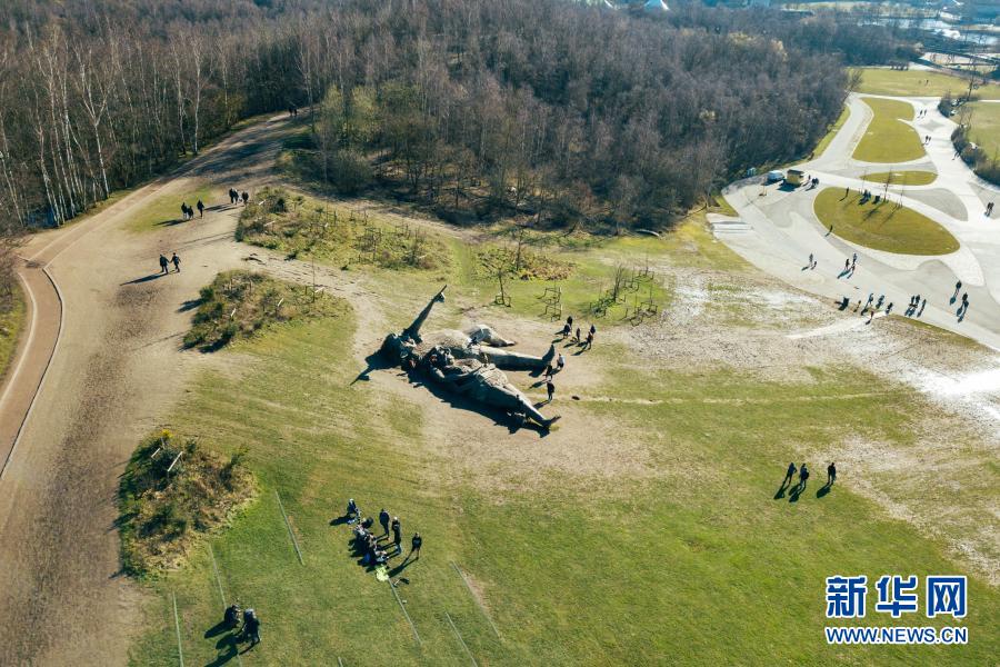 这是3月20日在比利时博姆市的德舒尔森林公园拍摄的“巨人”雕塑(无人机照片)。新华社记者 张铖 摄