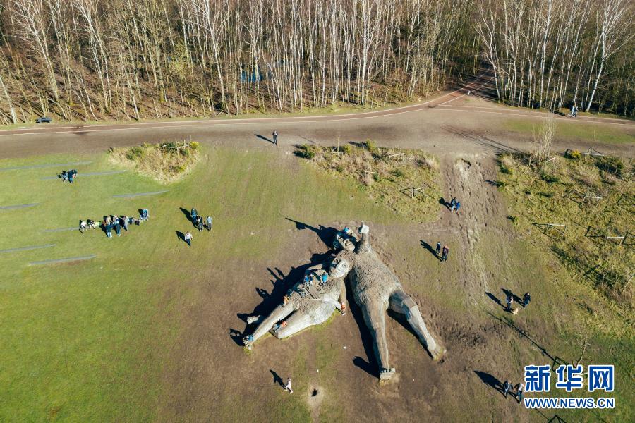 这是3月20日在比利时博姆市的德舒尔森林公园拍摄的“巨人”雕塑(无人机照片)。新华社记者 张铖 摄