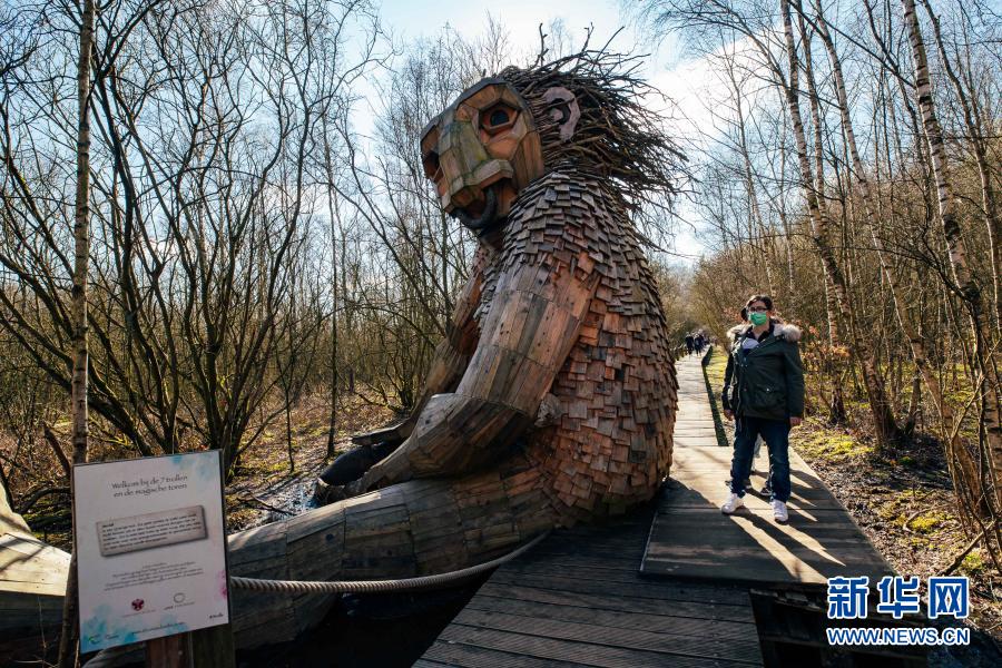 3月20日,人们在比利时博姆市的德舒尔森林公园观赏一座“巨人”雕塑。新华社记者 张铖 摄