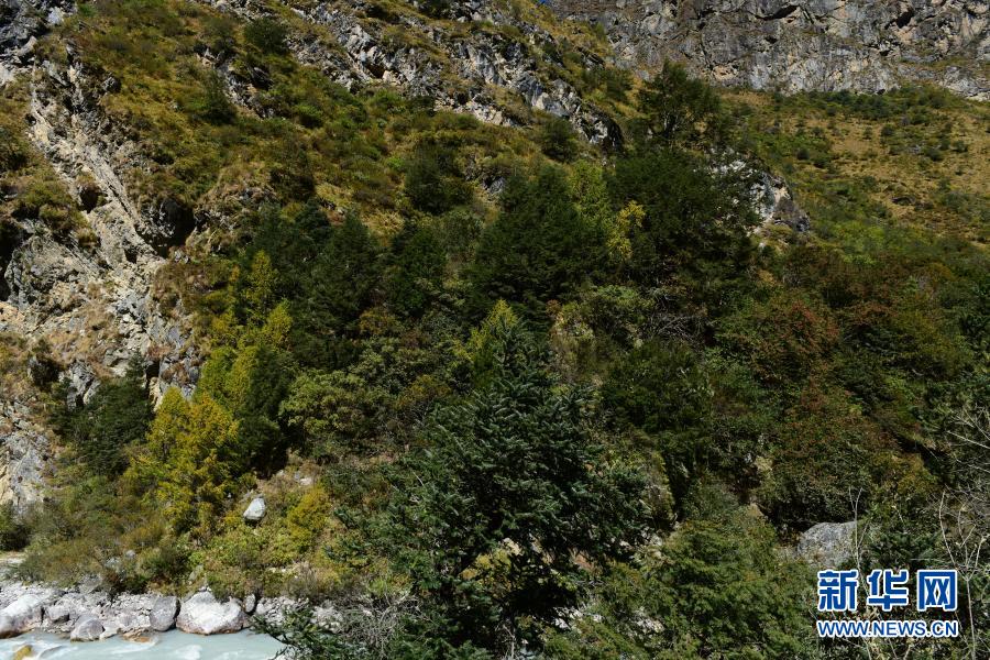 这是西藏定日县绒辖沟内一片含有密叶红豆杉的植物群落(2020年10月29日摄)。 新华社发(赵明旭 摄)