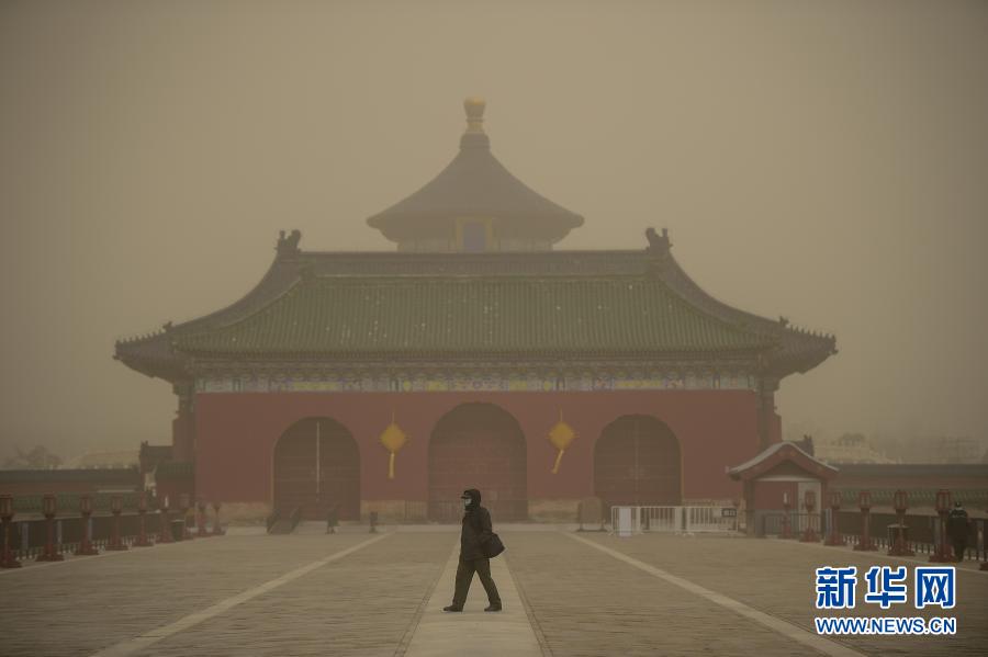 3月15日,市民在天坛公园内行走。3月15日,北京市遭遇沙尘天气。