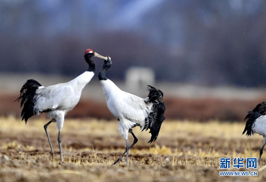 在林周县黑颈鹤自然保护区里拍摄的黑颈鹤(3月14日摄)。