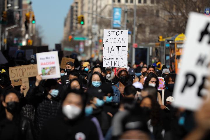 3月21日,在美国纽约,人们集会抗议针对亚裔的歧视行为和仇恨犯罪。(新华社记者王迎摄)