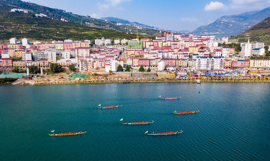 2020年12月12日,游客与当地村民在湖北宜昌市秭归县水田坝乡体验划龙舟(无人机照片)。新华社发(郑家裕摄)