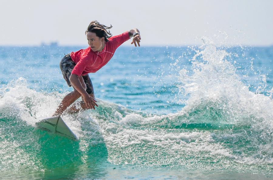 2019年2月27日,海南体育职业技术学院业余体校选手邱灼在第二届全国青年运动会冲浪体校组甲组男子短板决赛中。新华社记者杨冠宇摄