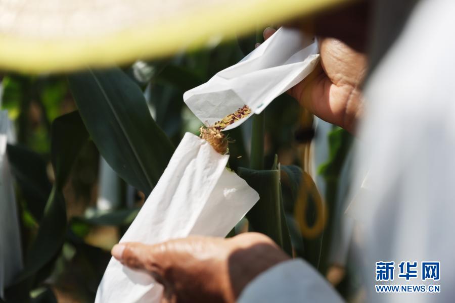 玉米育种专家程相文在三亚南繁育种基地对玉米进行采粉(2月24日摄)。新华社记者 张丽芸 摄