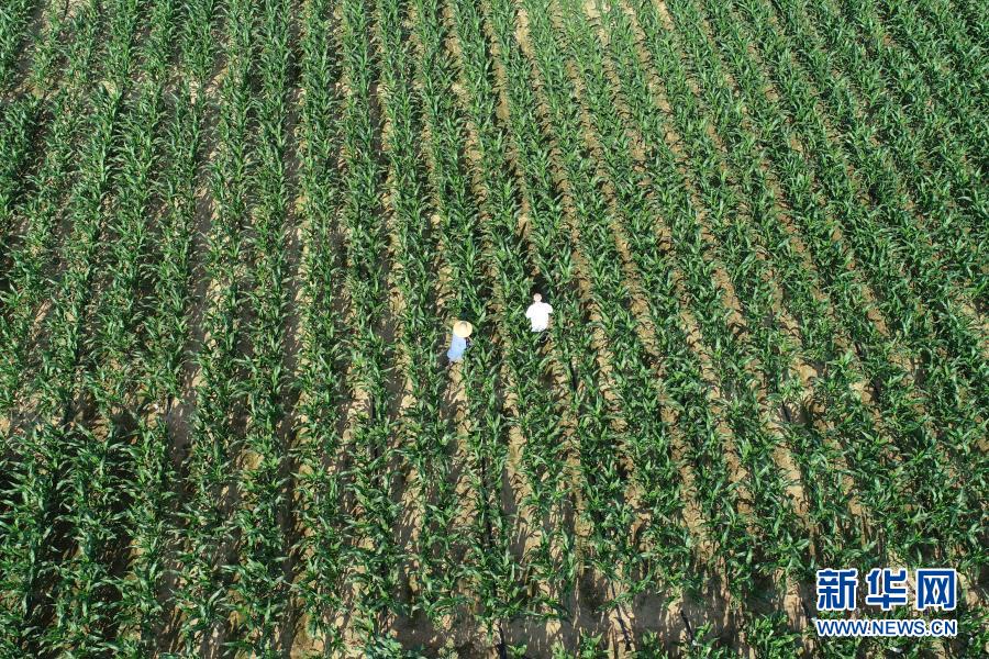 玉米育种专家三亚南繁育种基地观察玉米生长情况(2月24日摄,无人机照片)。新华社记者 张丽芸 摄