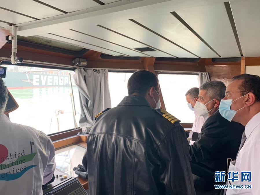 3月24日,埃及苏伊士运河管理局官员在一艘重型货船搁浅现场查看情况。新华社发