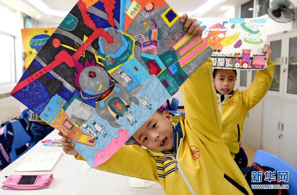 放学后在学校练习绘画的宝鸡市三迪小学学生在展示自己的画作(3月22日摄)。新华社记者 刘潇 摄