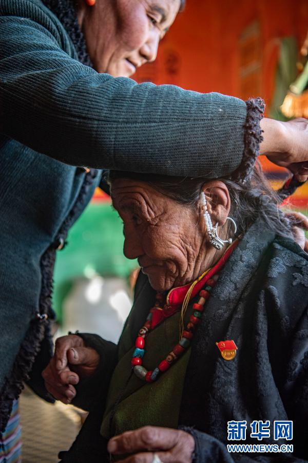家人帮旦增措姆整理头发(2月25日摄)。新华社记者 孙非 摄