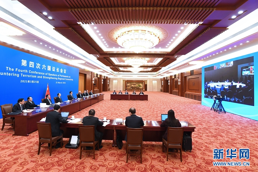 3月25日,全国人大常委会委员长栗战书在北京人民大会堂以视频方式出席第四次六国议长会议并发表讲话。新华社记者 饶爱民 摄