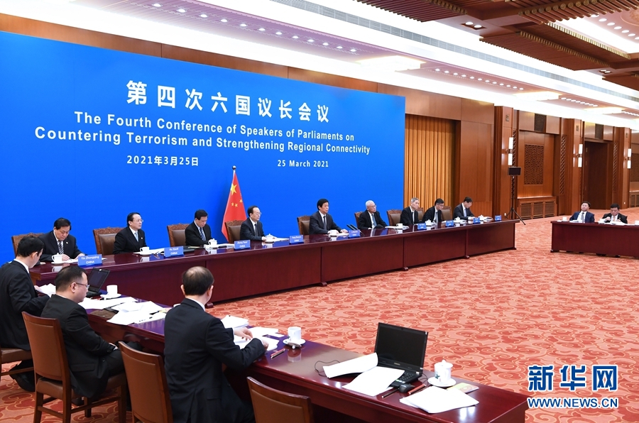 新华社北京3月25日电 全国人大常委会委员长栗战书25日在北京人民大会堂以视频方式出席第四次六国议长会议并发表讲话。