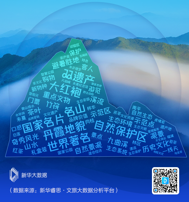 新华睿思语义分析结果显示,除了“名山”“大红袍”“青山绿水”等词之外,公众对武夷山的印象还有“双遗产”“国家名片”“丹霞地貌”“奇秀风光”“朱子理学”“智慧公园”“避暑胜地”等,武夷山景区印象丰富多元,独特魅力凸显。