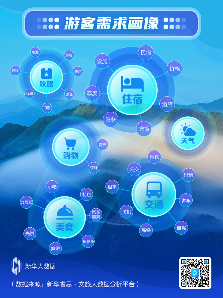 游客更注重旅行体验,“说走就走”成趋势。新华睿思文旅大数据平台通过游客对武夷山“吃、住、行”等旅游要素需求情况进行大数据分析,结果显示,随着人们出行意愿的增强,对旅游的品质要求也日益提高,如何住得经济实惠又舒适,如何快速舒适到达武夷山成为游客们比较关注的问题,占比分别为29.06%和25.57%。