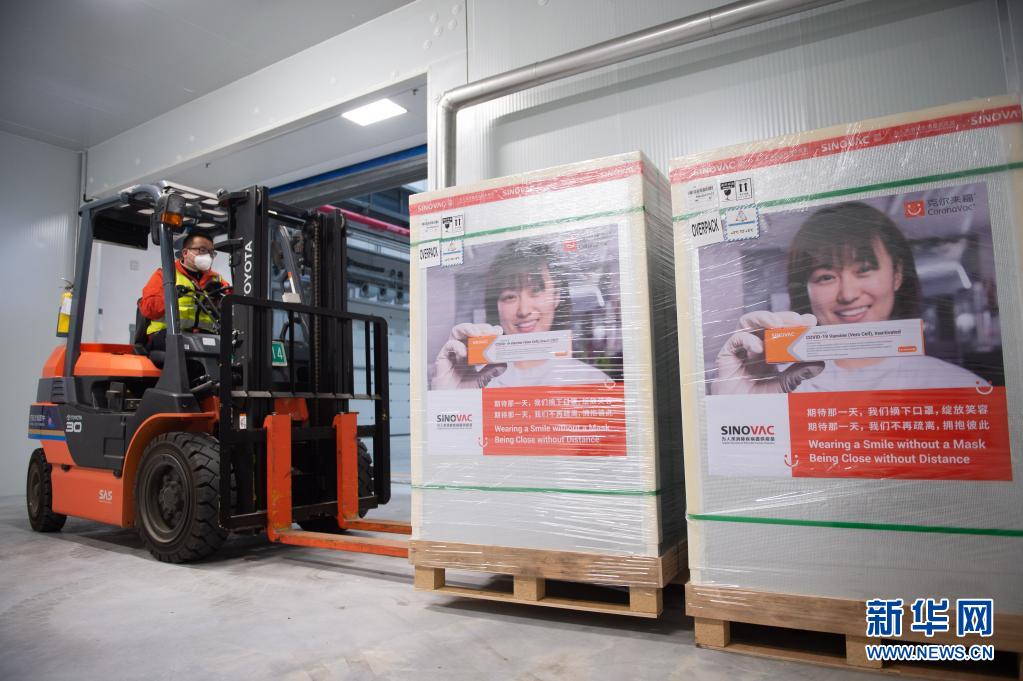 3月26日,在南航物流公司北京大兴国际货站,工作人员驾驶叉车将疫苗从冷库取出。新华社记者 陈钟昊 摄