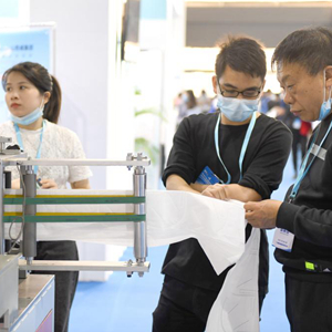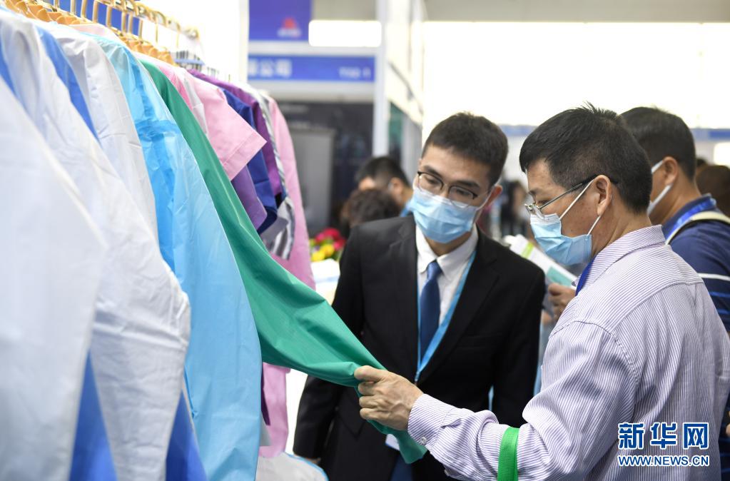 3月26日,采购商在展会上参观选购防护服。