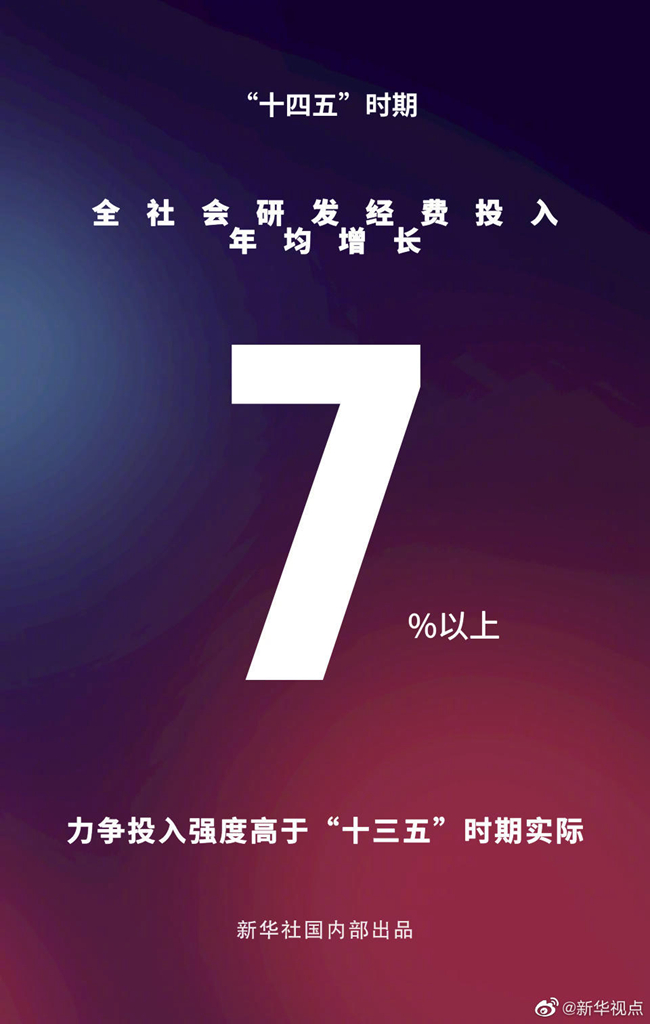 全社会研发经费投入,是一个国家和地区科技投入的重要构成,是衡量科技投入的重要指标,也是观察和分析科技发展实力和竞争力的重要指标。专家指出,年均增长7%以上,意味着未来五年我国全社会研发经费投入的年均实际增速要高于7%;力争投入强度高于“十三五”时期实际,体现了国家对科技创新的重视以及进一步加大投入的决心。