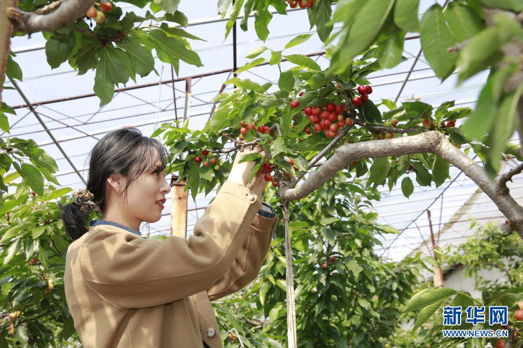 游客在山东省临沂市莒南县坪上镇的大棚樱桃园里采摘樱桃(3月24日摄)。新华社发(孙运亮 摄)
