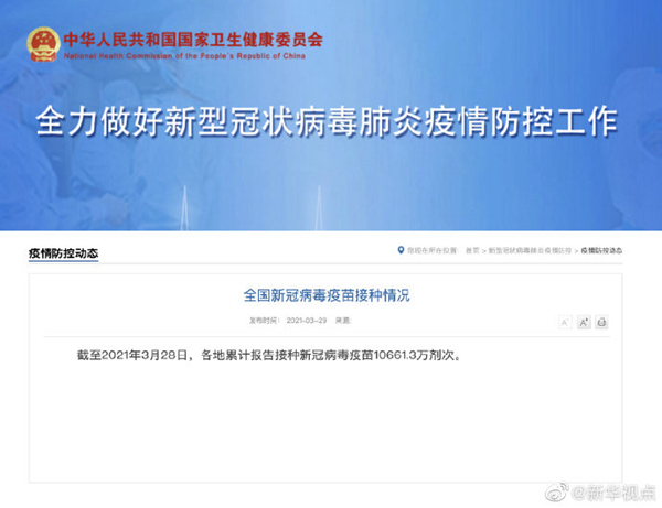 最大规模集中疫苗接种来了!国家卫健委29日发布,截至2021年3月28日,各地累计报告接种新冠病毒疫苗10661.3万剂次。