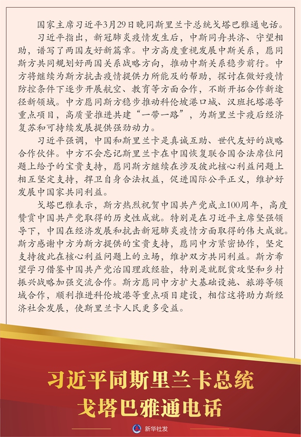 新华社北京3月29日电 国家主席习近平3月29日晚同斯里兰卡总统戈塔巴雅通电话。