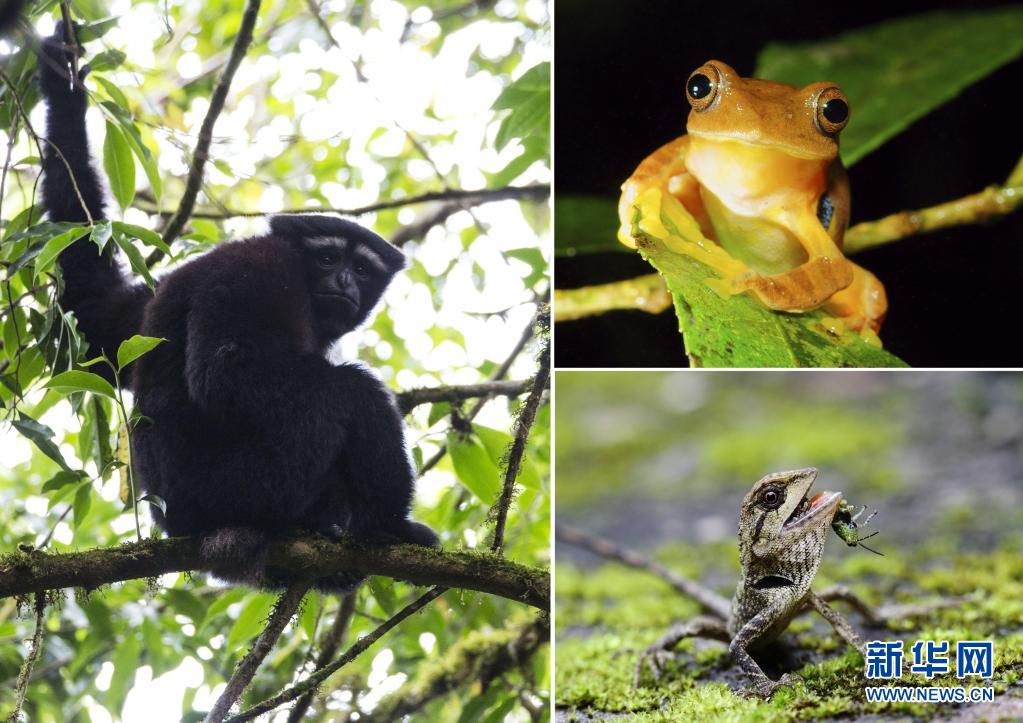 这张拼版照片显示的是高黎贡山国家级自然保护区的部分野生动物,左为天行长臂猿,右上为红蹼树蛙,右下为棕背树蜥(资料照片)。新华社发(高黎贡山国家级自然保护区保山管护局供图)