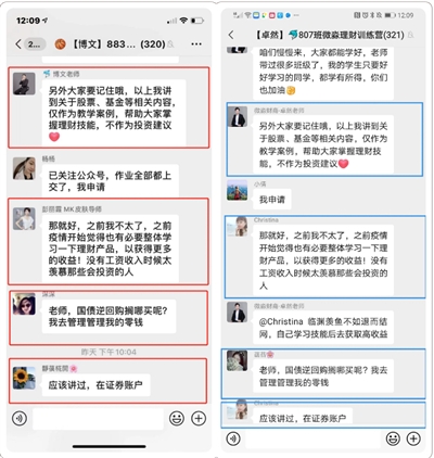 “没问题干嘛心虚踢人?”随即,她又通过另外一个手机号重新购买了一次课程,新进了一个班,这次她坚持听完12天的课。经过12天的学习,向女士发现,虽然她所进的班级不同、报名时间不同、“老师”也不同,但两位“老师”讲的内容却完全相同,“包括标点符号。”而且群内“学员”回复的内容也全都相同,“甚至不同的‘老师’都有同一个异地恋女友、且‘老师’给自己妈妈买的华为手机的订单截图都是同一个……”