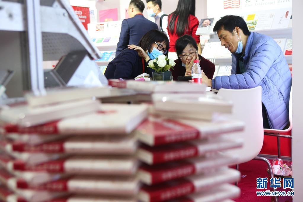 3月31日,参展人员在人民出版社展位交流。