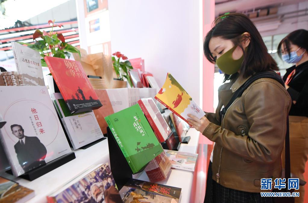 3月31日,参展人员在2021北京图书订货会上阅览书籍。