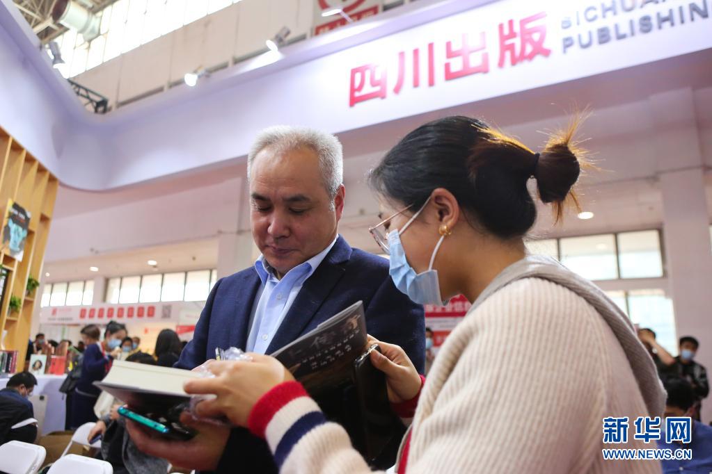 3月31日,在四川出版展区,新书《海上传奇》作者马骏杰为读者签名。