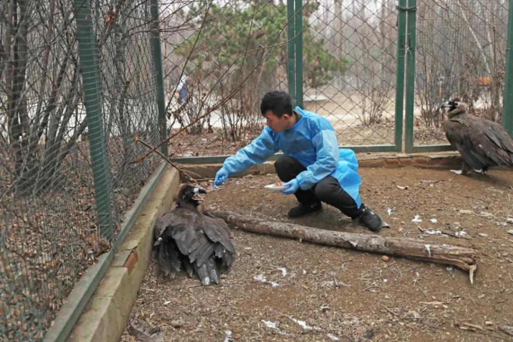 3月28日,白仁文在沈阳猛禽救助中心给受伤的秃鹫喂食。记者杨青摄